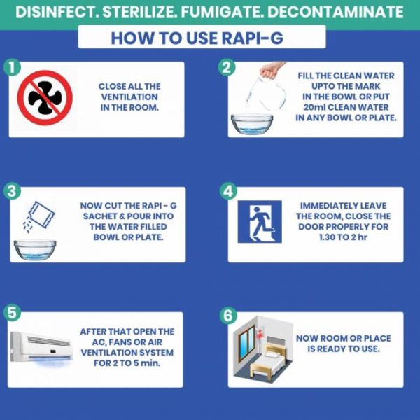 “Rapi-G” is an advance Gas disinfection system, it doesn’t require any fumigation machine, It is aPowder Sachet in which we need to add some prescribed amount of water, it immediately start releasing the Chlorine Dioxide Gas from it. This ClO2 gas is having more oxidizing ( Bacteria, virus & Spore killing) capacity in comparison to Ozone, Chlorine, Hydrogen peroxide, formaldehyde and Non carcinogenic etc.
